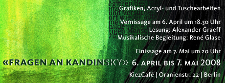 April 2011 Maria Lettberg | CD-Veröffentlichung »Erkki Melartin« Erkki Melartin. Das Solo Klavierwerk. Maria Lettberg. 2 CDs. Produktion: Deutschlandradio Kultur/Delta/Crystal Classics. KulturSpiegel | April 2011 | Gruß vom Chamäleon August 2010 Modern Solo Piano Festival ![]() am Donnerstag | 19.08.2010 | 18 Uhr Act 1 Maria Lettberg (Tango, SWE) | Act 2 Nik Bärtsch (Jazz, CH) www.modernsolopiano.info August 2010 Kulturradio am Vormittag am Mittwoch | 18.08.2010 | 11.45 Uhr | Radio Kultur (UKW Berlin: 92,4 MHz) Das Porträt. Maria Lettberg, Pianistin. | von Ulrike Klobes www.radiokultur-online.de Juni 2009 Research Festival Anlässlich des Festivals »Showcase of research in-and-through musical practice« wird das Projekt »Mysterium« erneut aufgeführt. Andrea Schmidt und Maria Lettberg werden außerdem in Vorträgen über das Projekt und ihre interdisziplinäre Zusammenarbeit sprechen. Das Festival findet in der Zeit vom 16.18. September 2009 am »Orpheus Institut« in Gent (Belgien) statt. www.orpheusinstituut.be Mai 2009 »Am Pulverfass! Los, Kanonenmann!« ![]() Andrea Schmidt gestaltet zur Musik der Berliner Avantgarde-Formation »KOMA69« die Video- und Lichtinstallationen. Konzert von KOMA69 | Freitag, 04.09.2009 | 21 Uhr | WABE (Danziger Straße 101, Berlin) www.koma69.com Februar 2009 »The Artist as Researcher« Maria Lettberg arbeitet als Forscherin und Künstlerin im musikwissenschaftlichen Bereich des Orpheus Institutes in Gent (Belgien). In dem Forschungsprojekt werden die Grenzen zwischen verschiedenen Künsten untersucht, Interdisziplinarität gefördert und auf diese Weise Synthesen zwischen Wissenschaft und Musik hergestellt. www.orpheusinstituut.be 2008/2009 Zum Jahreswechsel »Ich erschaffe die Welt durch meinen Humor, durch mein Lächeln, mein Seufzen, meine Zärtlichkeit, durch meinen Zorn, meine Hoffnung, meine Zweifel.« Alexander Skrjabin Wir wünschen ein farbenprächtiges und musikalisches neues Jahr und freuen uns auf weitere spannende Aufführungen! Dezember 2008 Maria Lettberg | Klavierabend am Freitag | 12.12.2008 | 20 Uhr | Gasteig Konzertsaal | München Im Programm: Werke von A. Skrjabin (1871-1915) SeptemberNovember 2008 Lehr- und Forschungsaufenthalt in Hangzhou (V. R. China) ![]() Abermals wird Andrea Schmidt an der China Art Academy in Hangzhou forschen und lehren. Neben ihrer Tätigkeit als Gastprofessorin beschäftigt sie sich 3 Monate lang intensiv mit der chinesischen Kunst und Kultur. Während dieser Zeit werden neue Bild-Ton-Transformationen entstehen, die bei zukünftigen Konzerten zur Aufführung gebracht werden. September 2008 Maria Lettberg | Klavierabend am Montag | 15.09.2008 | 20 Uhr | Oetkerhalle | Bielefeld Im Programm: Werke von A. Skrjabin (1871-1915) Juli 2008 Studienreise nach Amerika Andrea Schmidt reist drei Wochen durch Nordamerika und trifft dort Künstler und Musiker. Sie wird weiter an dem neuen Konzept zu Mysterium arbeiten. Mai 2008 Maria Lettberg | Veröffentlichung der Promotion ![]() Lettberg, Maria | Tendenser inom interpretationer av Alexander Skrjabins pianosonat nr 10: En jämförande pianistisk analys. (Tendencies within Interpretations of Alexander Scriabins Piano Sonata No. 10: A Comparative Pianistic Analysis. Submitted in partial fulfilment of the requirements for the Degree of Doctor in Music Art Study Programme) | Sibelius-Akatemia, 2008. Ethesis von Maria Lettberg: http://ethesis.siba.fi/ethesis/. Mai 2008 Promotion zum Doktor der Musik Das Rigorosum von Maria Lettberg findet am 17. Mai 2008 an der Sibelius Academy Helsinki in Finnland statt. Sie promovierte zu Alexander Skrjabin. April 2008 Kunstausstellung »Fragen an Kandinsky« Andrea Schmidt präsentiert Grafiken, Acryl- und Tuschearbeiten. Bild-Text-Transformationen zum gleichnamigen Buch von Alexander Graeff Ausstellung 06.04. bis 07.05.2008 | KiezCafè | Oranienstr. 22 | Berlin (Kreuzberg) ![]() Vernissage am Sonntag, den 6. April um 18.30 Uhr Zur Eröffnung der Ausstellung liest Alexander Graeff aus seinem Buch »Fragen an Kandinsky«. Musikalische Begleitung: René Glase. Anschließend Gespräch mit der Künstlerin. Finissage mit Musik und Lesung am Mittwoch, den 7. Mai um 20 Uhr. Februar 2008 »Lesezeit« | Deutschlandradio am Mittwoch | 05.02.2008 | 20.30 Uhr Sendung »Lesezeit« | Deutschlandradio | 97.7 (UKW) Maria Lettberg begleitet mit Werken von Alexander Skrjabin den Dichter Alexander Nitzberg. Er rezitiert aus seinem neuen Gedichtzyklus »Farbenklavier«. November 2007 Veröffentlichung der CD/DVD »Alexander Scrjabin. Das Solo-Klavierwerk« ![]() Alexander Scriabin. Das Solo Klavierwerk. Maria Lettberg. Gesamtausgabe, Box mit 8 CDs und DVD bei Capriccio/Delta. »Diese Box stellt eine absolute Katalogneuheit dar: auf acht CDs spielt die junge schwedische Pianistin Maria Lettberg das gesamte Klavierwerk des jung verstorbenen, genial-exzentrischen russischen Komponisten Alexander Scriabin. Seine Musik fußt in der romantischen Tradition von Chopin, Scriabin entwickelt aber immer stärker eine eigene Tonsprache und bezieht philosophische Theorien in sein grenzüberschreitendes Universum mit ein. Auf der Bonus-DVD sind faszinierende Visualisierungen von Scriabins Musik zu erleben der Komponist verband seine Musik mit Farb- verläufen, die hier von der Designerin Andrea Schmidt umgesetzt wurden.« [www.jpc.de] Juni 2007 Maria Lettberg | Klavierabend am Sonntag | 10.06.2007 | 20 Uhr Schwartzsche Villa | Grunewaldstraße 55 | Berlin-Steglitz Eintritt: 12 / 8 Euro | Karten an der Abendkasse Im Programm: Werke von A. Skrjabin (1871-1915) 2 Poèmes Op.63 | 4 Morceux Op.56 | Poème Op.41 | Valse Op.38 | 2 Impromptu Op.14 | 2 Imptomptus Op.12 | *Pause* | 2 Impromptus Op.10 | 8 Etder Op.42 | 2 Poèmes Op.44 | Scherzo Op.46 | Quasi Valse Op.47 | 2 Poèmes Op.69 | Valse Op.1 Mai 2007 Videoaufnahmen für DVD-Produktion bei Capriccio/Delta ![]() Am 10. Mai 2007 werden die Videosequenzen für die Bonus-DVD zur 7-teiligen CD-Reihe mit Werken von Alexan